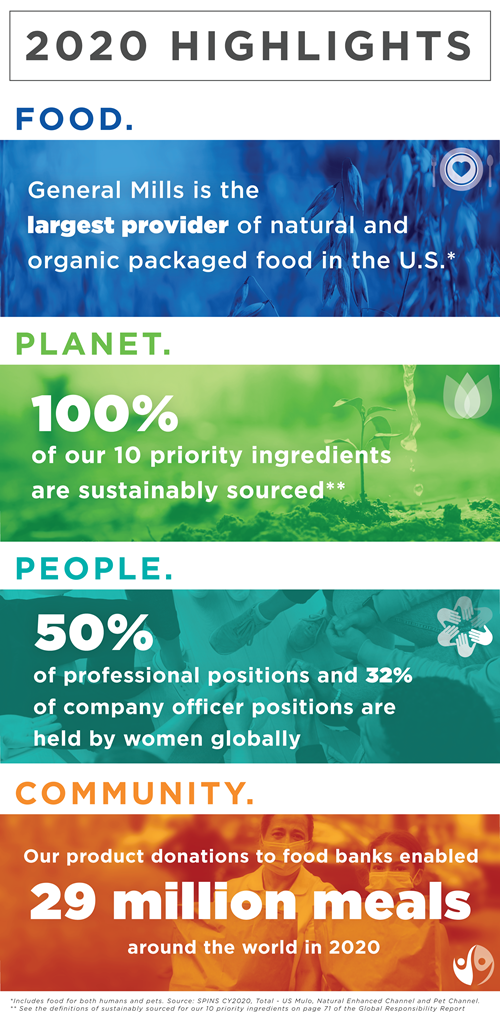 “The events of this past year – COVID-19 and the racial injustice and social equity movements – reaffirmed our belief that our scale brings opportunity and responsibility. We can and should do good things that impact our people, our planet and the communities we serve,” says Jeff Harmening, chairman and CEO, General Mills.